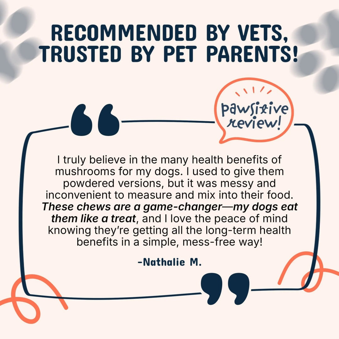 Developed with veterinary nutritionists, our mushroom chews are crafted for maximum potency and efficacy. Proudly made in the USA, each batch undergoes rigorous testing for purity and potency. We use only therapeutic-grade ingredients, free from preservatives or fillers—delivering real results you can see in your dog’s health, energy, and vitality.
